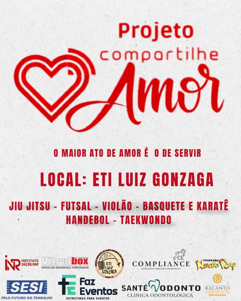 O Projeto Compartilhe Amor reitera seu compromisso em contribuir para o crescimento integral dos jovens, promovendo valores de solidariedade, respeito mútuo e cooperação. Junte-se a nós nesta jornada de aprendizado e transformação. O amor maior ato de amor é o de servir, o amor está no ar, e na Escola Municipal ETI Luiz Gonzaga, ele se compartilha.