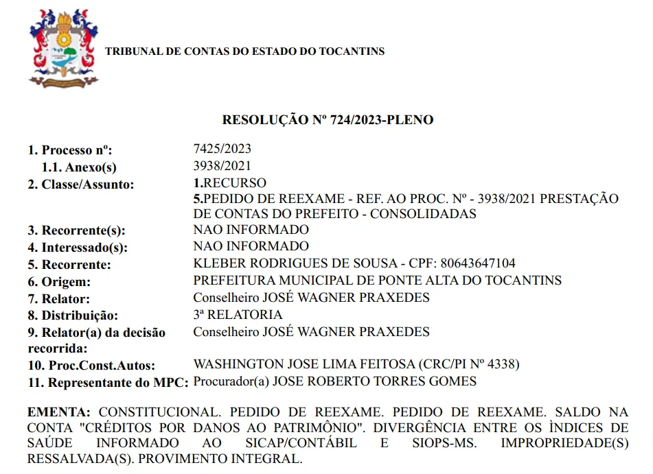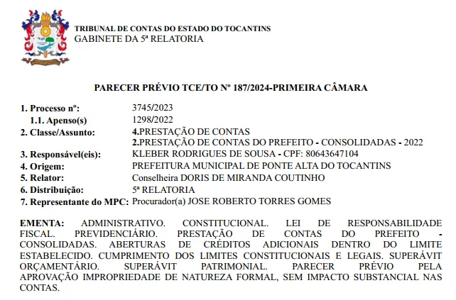 A Câmara também recebeu os pareceres prévios do Tribunal de Contas do Estado do Tocantins (TCE-TO) referentes às contas consolidadas do município de Ponte Alta do Tocantins, sob gestão do ex-prefeito Kleber Rodrigues de Sousa, relativas aos exercícios de 2020, 2021 e 2022.